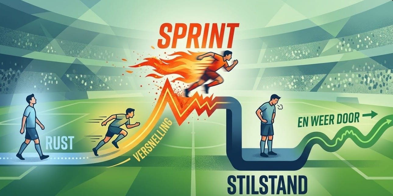 Dat betekent dat je lichaam continu schakelt: actie → korte pauze → actie → opnieuw versnellen. Juist dat maakt voetbal zwaar.