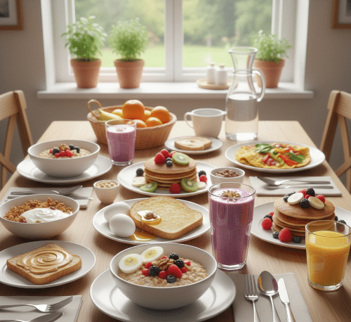 Wanneer je weinig tijd hebt, is een sneller ontbijt ook geschikt, zoals Griekse yoghurt met granola en banaan, een smoothie met havermout, fruit en proteïne en een snee volkoren brood met pindakaas. Bij een vroege wedstrijd kun je kiezen voor een uitgebreider ontbijt, bijvoorbeeld volkoren pannenkoeken met fruit, een omelet met groenten en een glas sinaasappelsap voor extra vitamine C.